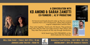 A Conversation with AZ if Productions | Kd Amond & Sarah Zanotti File under: on September 22, 2023 Calendar Add to Calendar Add to Timely Calendar Add to Google Add to Outlook Add to Apple Calendar Add to other calendar Export to XML When: September 29, 2023 @ 10:00 am – 10:50 am 2023-09-29T10:00:00-05:00 2023-09-29T10:50:00-05:00 Where: Johnson Large Theater Room 115 Contact: Nina Woodard 615.460.5988 Email Career Development Seminar Student Enrichment