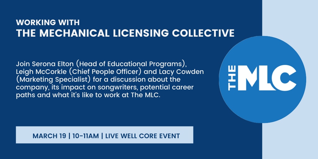 Working With The Mechanical Licensing Collective File under: on February 26, 2021March 12, 2021 Calendar Add to Calendar Add to Timely Calendar Add to Google Add to Outlook Add to Apple Calendar Add to other calendar Export to XML When: March 19, 2021 @ 10:00 am – 11:00 am 2021-03-19T10:00:00-05:00 2021-03-19T11:00:00-05:00 Where: Blackboard - Live WELL Core Events Contact: Nina Woodard Email