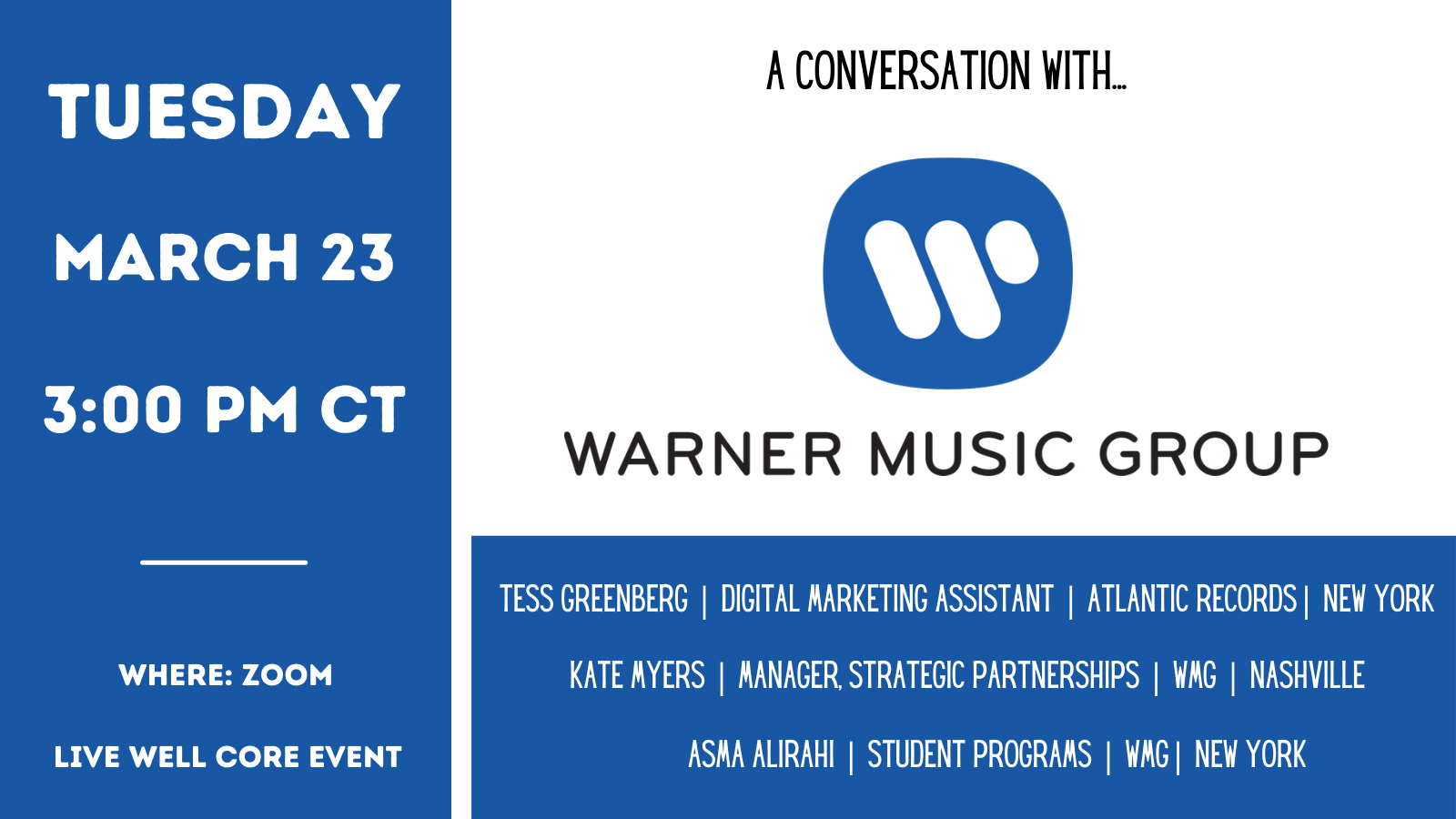 WMG’s family of labels—including Atlantic Records, Elektra Music Group, Parlophone, and Warner Records—is among the most prominent and successful in the history of music, encompassing a global roster of acclaimed artists and an unparalleled catalog including many of the world’s most popular and influential recordings.  Our panel of industry guests will share their professional journeys with WMG and also provide details regarding current internship, part-time and full-time opportunities.