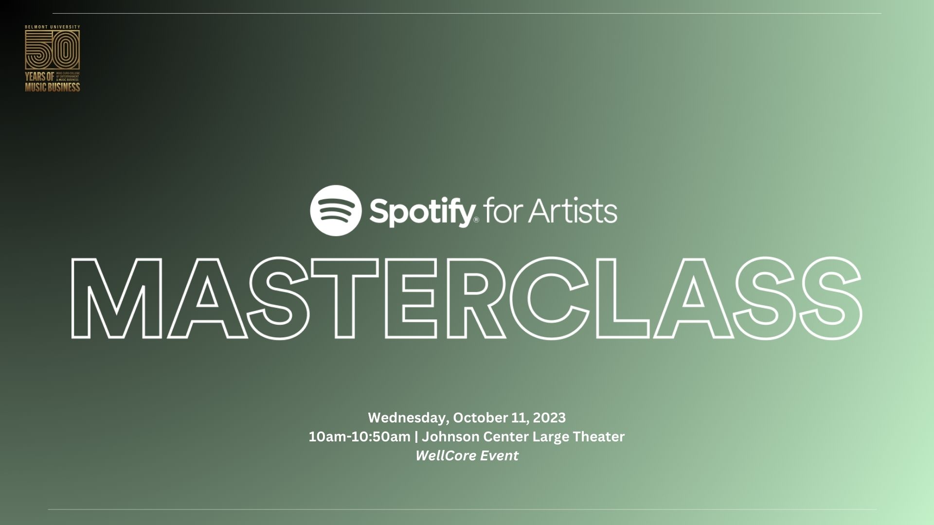 A Spotify fo Artists Masterclass | WellCore/ Seminar File under: on October 1, 2023October 6, 2023 Calendar Add to Calendar Add to Timely Calendar Add to Google Add to Outlook Add to Apple Calendar Add to other calendar Export to XML When: October 11, 2023 @ 10:00 am – 11:00 am 2023-10-11T10:00:00-05:00 2023-10-11T11:00:00-05:00 Where: Johnson Center Large Theater