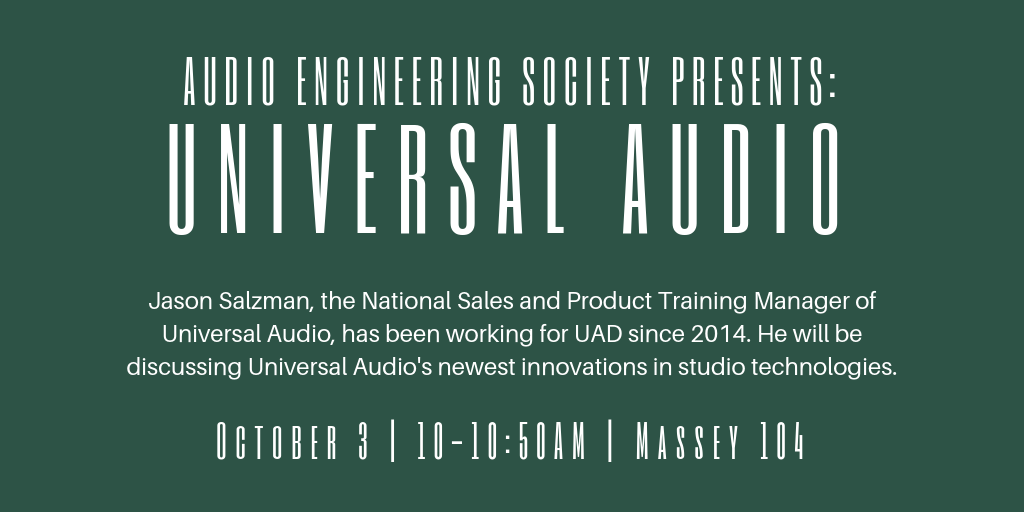 AES Presents: Universal Audio File under: on September 24, 2018 Calendar Add to Calendar Add to Timely Calendar Add to Google Add to Outlook Add to Apple Calendar Add to other calendar Export to XML When: October 3, 2018 @ 10:00 am – 10:50 am 2018-10-03T10:00:00-05:00 2018-10-03T10:50:00-05:00 Where: Massey 104 Contact: Emily Reynolds Email