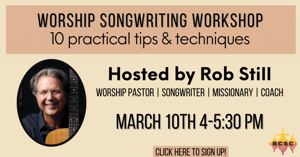 BCSC: Worship Songwriting Workshop File under: on March 4, 2021 Calendar Add to Calendar Add to Timely Calendar Add to Google Add to Outlook Add to Apple Calendar Add to other calendar Export to XML When: March 10, 2021 @ 4:00 pm – 5:30 pm 2021-03-10T16:00:00-06:00 2021-03-10T17:30:00-06:00 Where: Zoom Contact: Anna Pearson Email