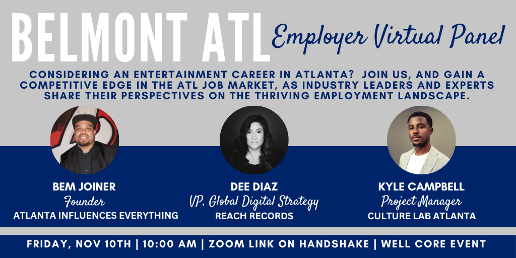 Considering an entertainment career in Atlanta? Join us, and gain a competitive edge in the ATL job market, as industry leaders and experts share their perspectives on the thriving employment landscape. Orchestrated by Richard Dunn, Belmont Atlanta On-Site Program Manager, this discussion will offer valuable insights into the skills, qualities, and experiences sought by employers in various sectors and provides a unique chance to explore potential career paths.