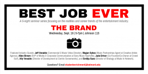 Best Job Ever: The BRAND File under: on September 7, 2018September 17, 2018 Calendar Add to Calendar Add to Timely Calendar Add to Google Add to Outlook Add to Apple Calendar Add to other calendar Export to XML When: September 19, 2018 @ 5:00 pm – 7:00 pm 2018-09-19T17:00:00-05:00 2018-09-19T19:00:00-05:00 Where: Johnson 115 - Large Theater Contact: Jenny Parsons Email