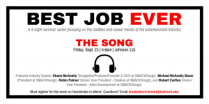 Best Job Ever: The SONG File under: on September 7, 2018September 17, 2018 Calendar Add to Calendar Add to Timely Calendar Add to Google Add to Outlook Add to Apple Calendar Add to other calendar Export to XML When: September 21, 2018 @ 4:00 pm – 6:00 pm 2018-09-21T16:00:00-05:00 2018-09-21T18:00:00-05:00 Where: Johnson 115 - Large Theater Contact: Jenny Parsons Email