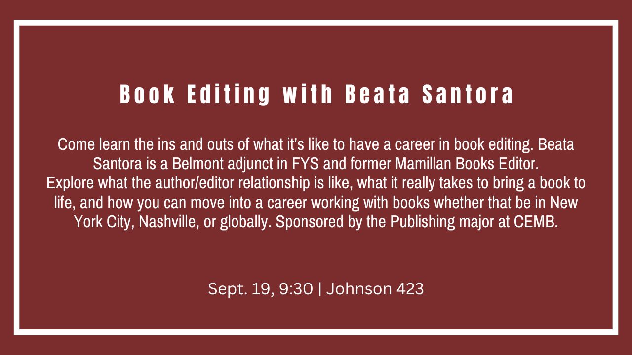 Book Editing with Beata Santora File under: on September 11, 2023 Calendar Add to Calendar Add to Timely Calendar Add to Google Add to Outlook Add to Apple Calendar Add to other calendar Export to XML When: September 19, 2023 @ 9:30 am – 10:45 am 2023-09-19T09:30:00-05:00 2023-09-19T10:45:00-05:00 Where: Johnson Center 423