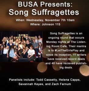BUSA Week: Song Suffragettes File under: on October 29, 2018 Calendar Add to Calendar Add to Timely Calendar Add to Google Add to Outlook Add to Apple Calendar Add to other calendar Export to XML When: November 7, 2018 @ 10:00 am – 10:50 am 2018-11-07T10:00:00-06:00 2018-11-07T10:50:00-06:00 Where: Johnson 115 Seminar Student Enrichment
