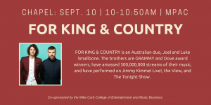 Chapel: For King & Country File under: on July 26, 2018August 27, 2018 Calendar Add to Calendar Add to Timely Calendar Add to Google Add to Outlook Add to Apple Calendar Add to other calendar Export to XML When: September 10, 2018 @ 10:00 am – 10:50 am 2018-09-10T10:00:00-05:00 2018-09-10T10:50:00-05:00 Where: MPAC Contact: University Ministries