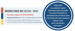 CMA EDU Kick-Off Meeting + Mixer File under: on August 22, 2018 Calendar Add to Calendar Add to Timely Calendar Add to Google Add to Outlook Add to Apple Calendar Add to other calendar Export to XML When: August 30, 2018 @ 6:30 pm – 7:30 pm 2018-08-30T18:30:00-05:00 2018-08-30T19:30:00-05:00 Where: Massey Boardroom (4th Floor of Massey Business Center) Contact: Jamie Wendt Email