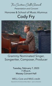 Cody Fry | The Curtain Call Award File under: on January 25, 2023 Calendar Add to Calendar Add to Timely Calendar Add to Google Add to Outlook Add to Apple Calendar Add to other calendar Export to XML When: February 7, 2023 @ 7:30 pm – 9:00 pm 2023-02-07T19:30:00-06:00 2023-02-07T21:00:00-06:00 Where: Massey Performing Arts Center Contact: Nina Woodard 615.460.5988 Email Career Development Seminar Student Enrichment