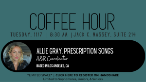 MUST REGISTER ON HANDSHAKE! Join us in the Jack C. Massey Admission Building. Grab coffee downstairs and meet us at Suite 214. Limited to entertainment industry majors and minors, sophomores, juniors, and seniors. If the event is full, please join the waitlist on Handshake as additional students often get into the event.