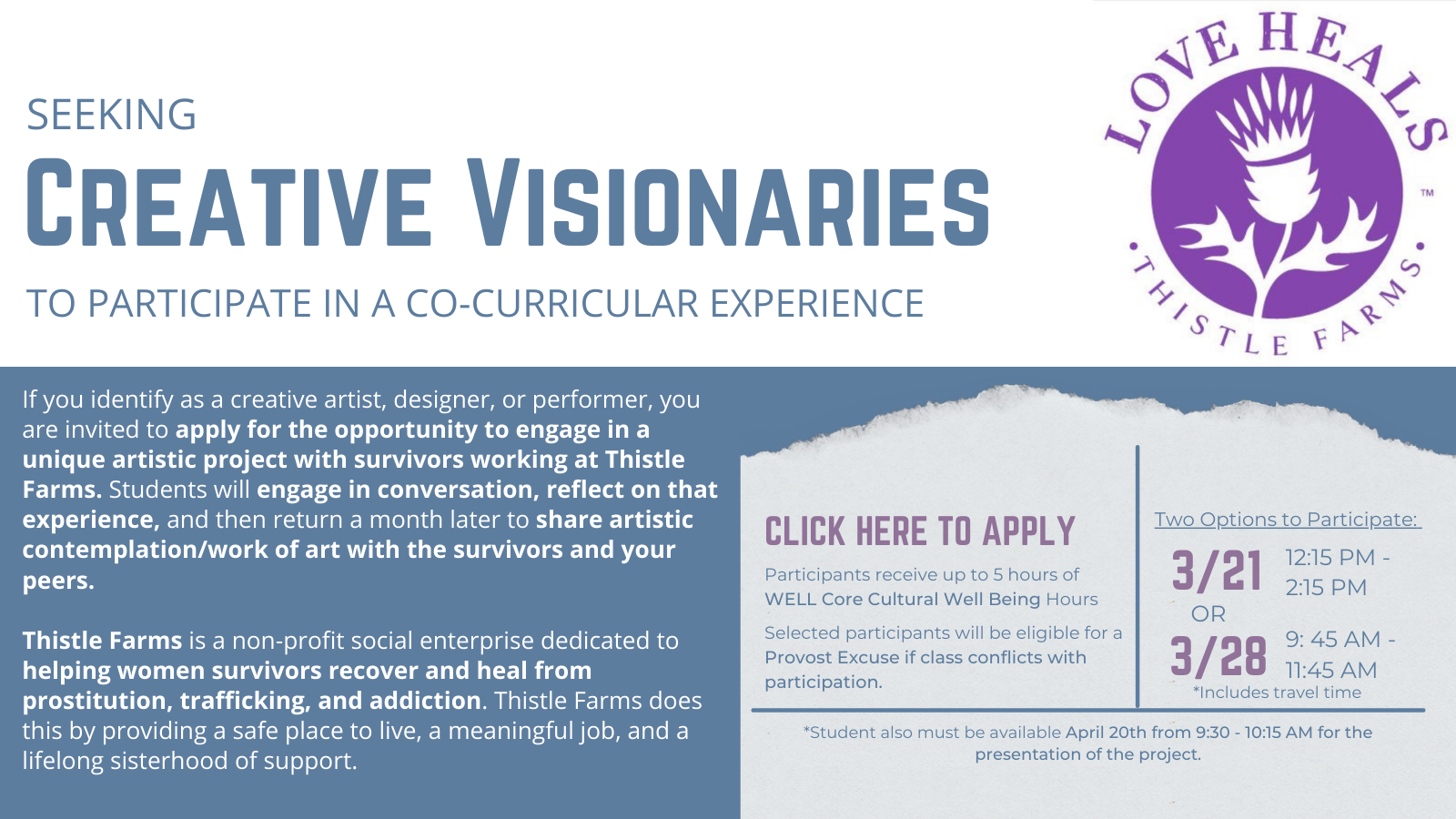 Creative Visionaries at Thistle Farms File under: on March 7, 2022 Calendar Add to Calendar Add to Timely Calendar Add to Google Add to Outlook Add to Apple Calendar Add to other calendar Export to XML When: March 21, 2022 @ 12:15 pm – 2:15 pm 2022-03-21T12:15:00-05:00 2022-03-21T14:15:00-05:00 Career Development Student Enrichment CLICK HERE to apply to participate!