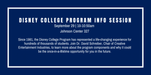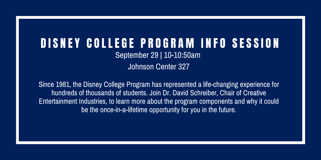 Disney College Program File under: on September 1, 2021 Calendar Add to Calendar Add to Timely Calendar Add to Google Add to Outlook Add to Apple Calendar Add to other calendar Export to XML When: September 29, 2021 @ 10:00 am – 10:50 am 2021-09-29T10:00:00-05:00 2021-09-29T10:50:00-05:00 Where: Johnson Center 327 Contact: David Schreiber Email