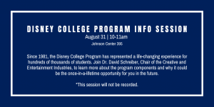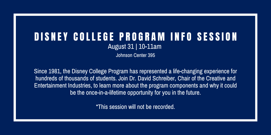 DISNEY COLLEGE PROGRAM File under: on August 1, 2022August 19, 2022 Calendar Add to Calendar Add to Timely Calendar Add to Google Add to Outlook Add to Apple Calendar Add to other calendar Export to XML When: August 31, 2022 @ 10:00 am – 11:00 am 2022-08-31T10:00:00-05:00 2022-08-31T11:00:00-05:00 Where: Johnson Center 395 Cost: Free