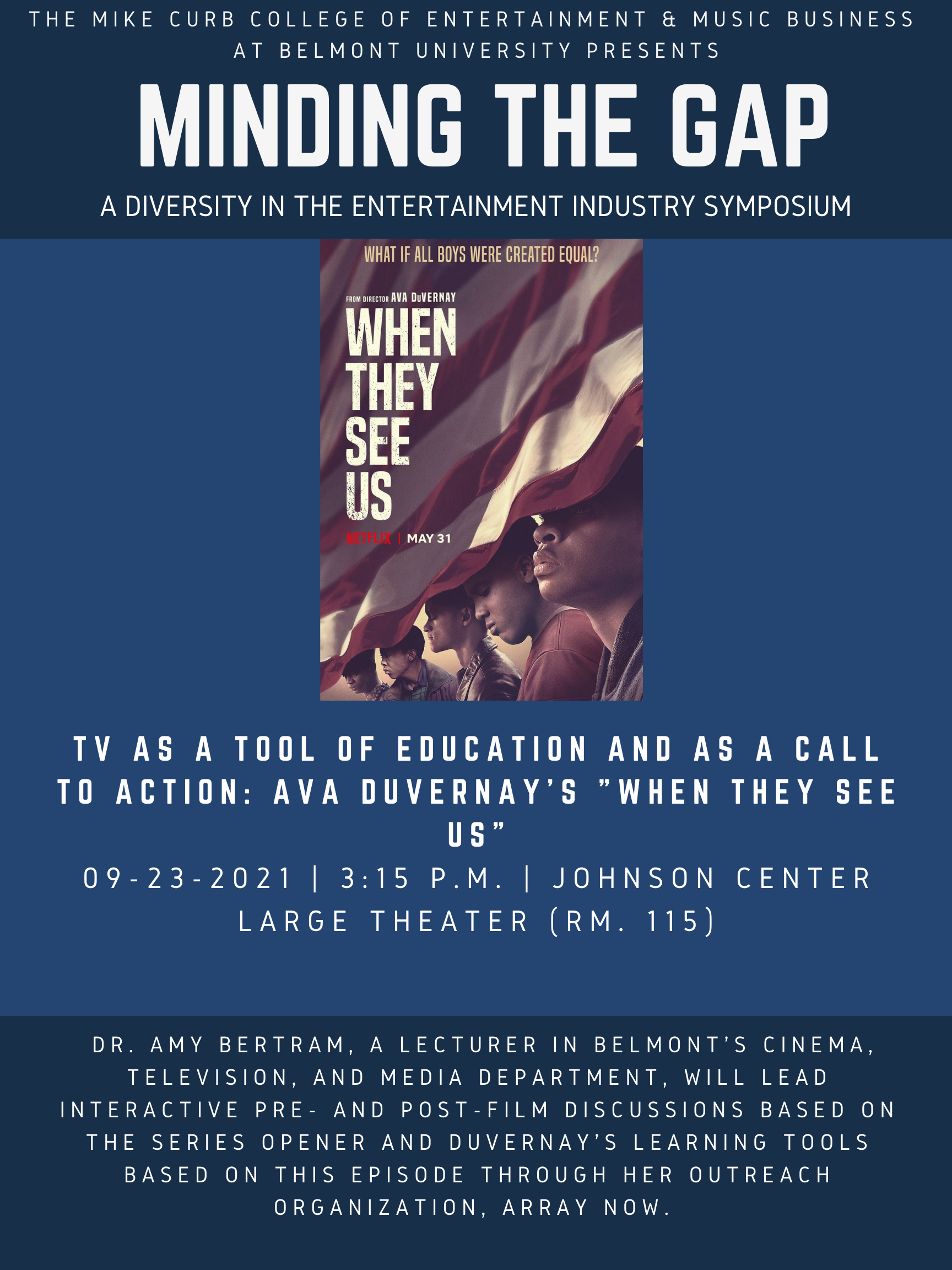 Ava DuVernay’s four-part series for Netflix, “When They See Us” (2019), depicts the unjust arrest and incarceration of the Central Park Five and their lives since. Dr. Amy Bertram, a Lecturer in Belmont’s Cinema, Television, and Media Department, will lead interactive pre- and post-film discussions based on the series opener and DuVernay’s learning tools based on this episode through her outreach organization, Array Now.
