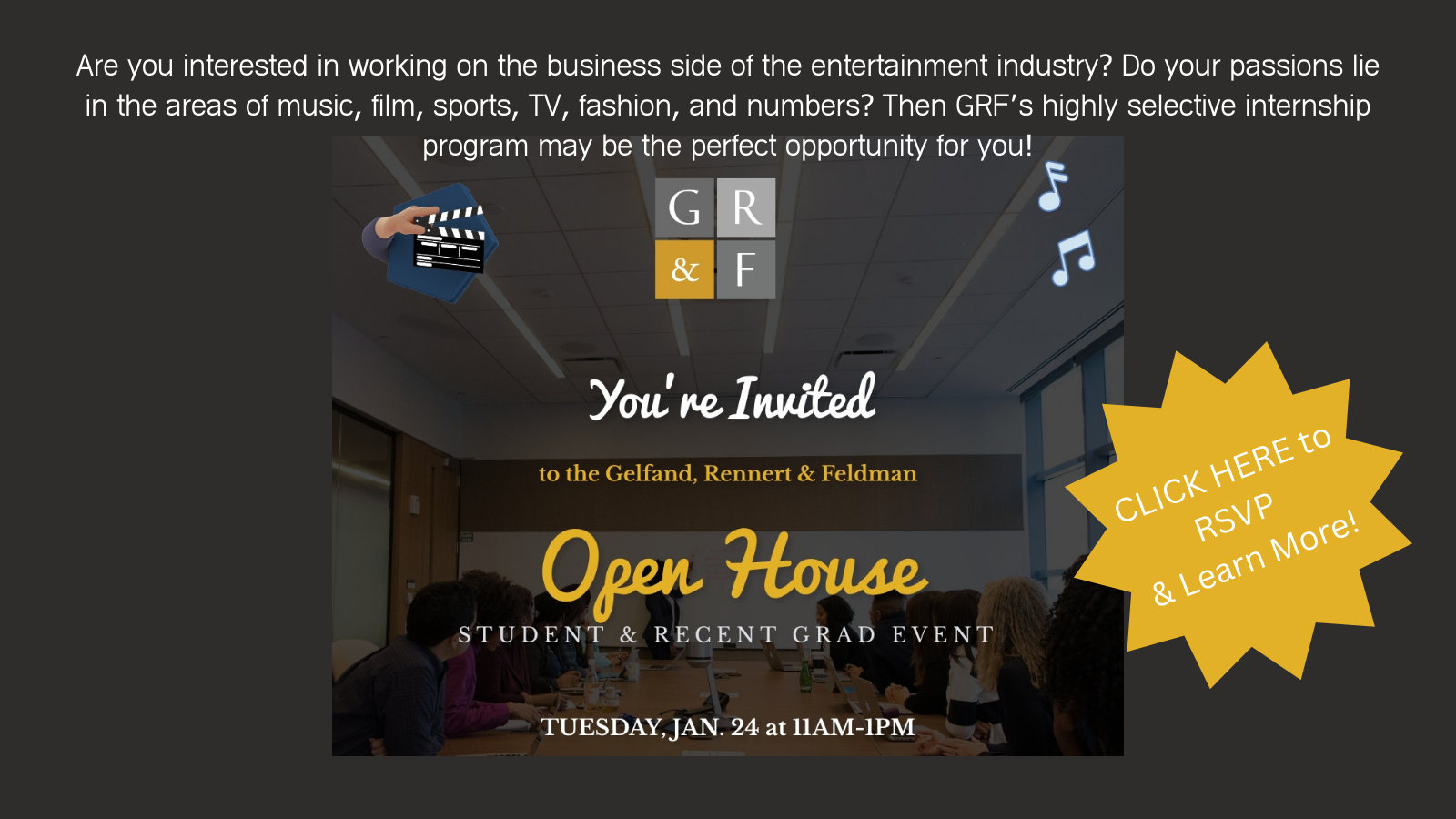 Entertainment Business Management Open House File under: on January 4, 2023 Calendar Add to Calendar Add to Timely Calendar Add to Google Add to Outlook Add to Apple Calendar Add to other calendar Export to XML When: January 24, 2023 @ 11:00 am – 1:00 pm 2023-01-24T11:00:00-06:00 2023-01-24T13:00:00-06:00 Career Development