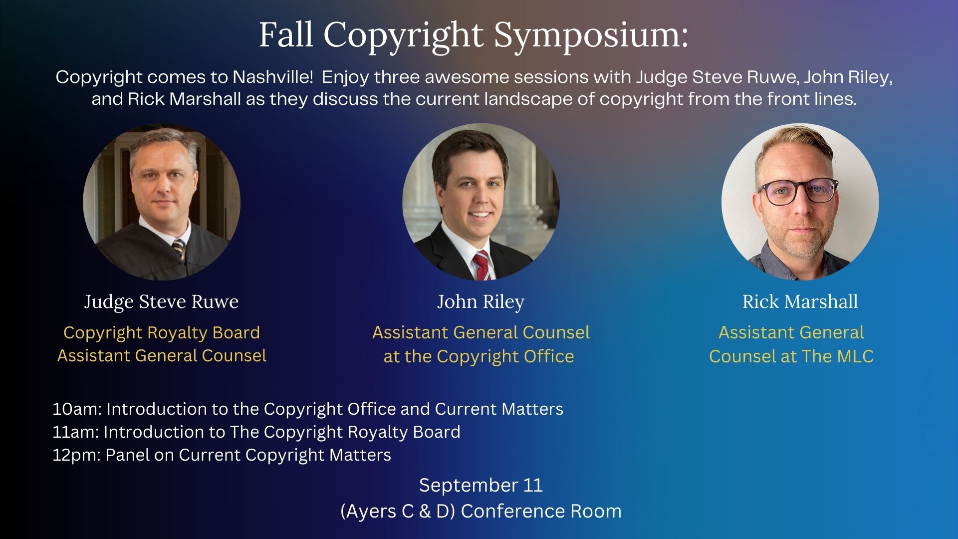 Fall Copyright Symposium File under: on September 4, 2023 Calendar Add to Calendar Add to Timely Calendar Add to Google Add to Outlook Add to Apple Calendar Add to other calendar Export to XML When: September 11, 2023 @ 10:00 pm – 1:00 pm 2023-09-11T22:00:00-05:00 2023-09-11T13:00:00-05:00 Where: (Ayers C & D) Conference Room