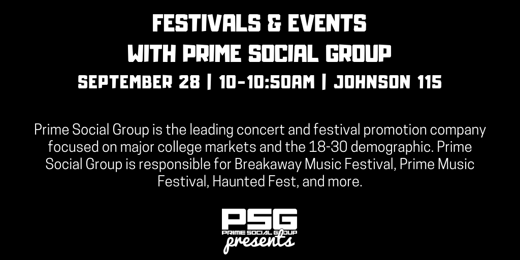 Festivals & Events with Prime Social Group File under: on September 17, 2018 Calendar Add to Calendar Add to Timely Calendar Add to Google Add to Outlook Add to Apple Calendar Add to other calendar Export to XML When: September 28, 2018 @ 10:00 am – 10:50 am 2018-09-28T10:00:00-05:00 2018-09-28T10:50:00-05:00 Where: Johnson 115 - Large Theater Contact: Jenny Parsons Email