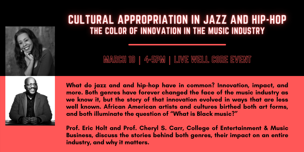 Cultural Appropriation in Jazz and Hip-Hop: The Color of Innovation in the Music Industry File under: on February 12, 2021March 1, 2021 Calendar Add to Calendar Add to Timely Calendar Add to Google Add to Outlook Add to Apple Calendar Add to other calendar Export to XML When: March 10, 2021 @ 4:00 pm – 5:00 pm 2021-03-10T16:00:00-06:00 2021-03-10T17:00:00-06:00 Where: Blackboard - Live WELL Core Events Contact: Jenny Lokey Email