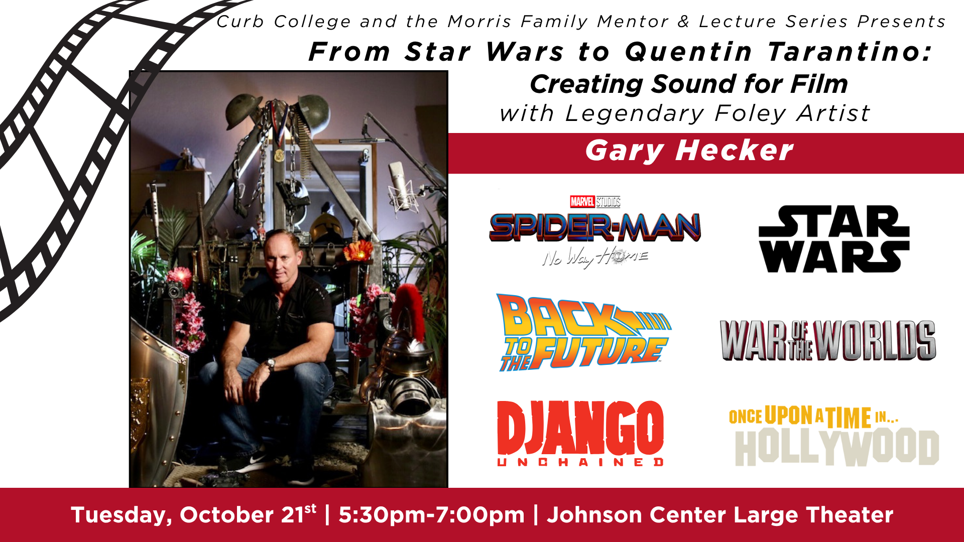 Gary Hecker, well-known in Hollywood and worldwide as being one of the top Foley Sound FX Artists, will be joining us on campus as he demonstrates his work, which has brought some of Hollywood’s biggest movies to life, and shares insight he has gained from his years working in the industry.