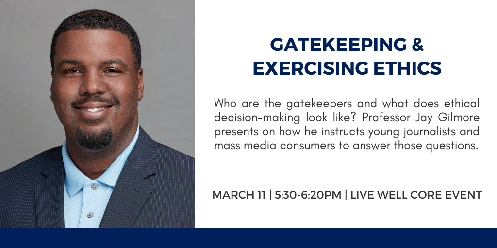 Gatekeeping & Exercising Ethics File under: on March 4, 2021 Calendar Add to Calendar Add to Timely Calendar Add to Google Add to Outlook Add to Apple Calendar Add to other calendar Export to XML When: March 11, 2021 @ 5:30 pm – 6:20 pm 2021-03-11T17:30:00-06:00 2021-03-11T18:20:00-06:00 Where: Blackboard - Live WELL Core Events Contact: Dr. Syb Brown Email