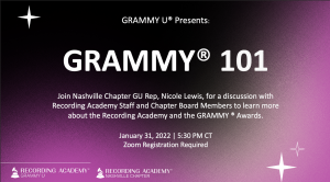 Grammy 101 File under: on January 21, 2022January 24, 2022 Calendar Add to Calendar Add to Timely Calendar Add to Google Add to Outlook Add to Apple Calendar Add to other calendar Export to XML When: January 31, 2022 @ 5:30 pm – 6:30 pm 2022-01-31T17:30:00-06:00 2022-01-31T18:30:00-06:00 Where: Virtual Contact: Alex Quattlebaum 615-460-6259 Email RSVP Here