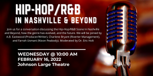 Hip-Hop / R&B Scene In Nashville and Beyond File under: on January 31, 2022February 14, 2022 Calendar Add to Calendar Add to Timely Calendar Add to Google Add to Outlook Add to Apple Calendar Add to other calendar Export to XML When: February 16, 2022 @ 10:00 am – 10:50 am 2022-02-16T10:00:00-06:00 2022-02-16T10:50:00-06:00 Where: Johnson 115 Contact: Alex Quattlebaum 615-460-6259 Email Seminar WELL Core Credit: Occupational/Financial Well-Being