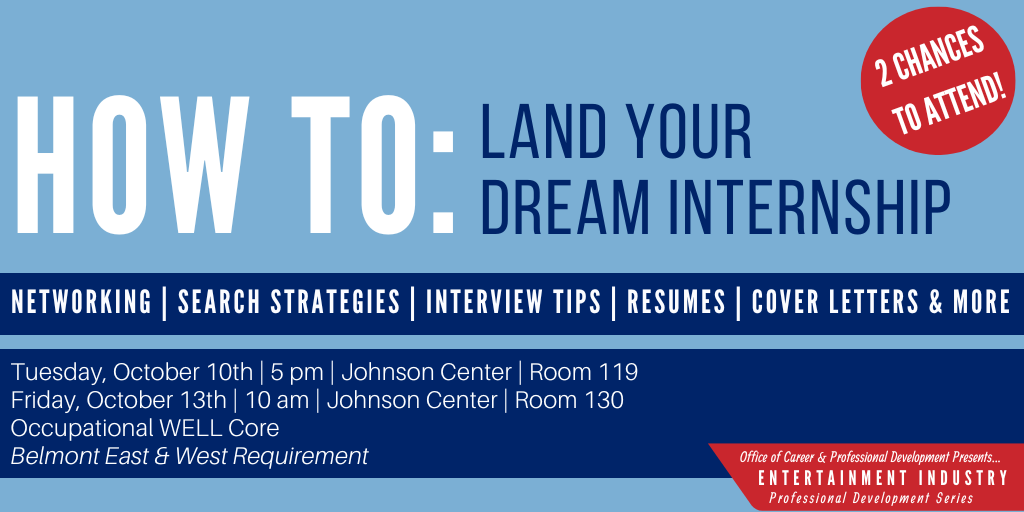 This workshop will cover core principles, along with some entertainment industry specific tips, for building an outstanding professional resume, writing an attention-grabbing cover letter, preparing for video interviews, developing industry relationships, and searching for internships in Nashville, New York or Los Angeles. Come prepared with great questions and get ready to maximize your time at Belmont!
