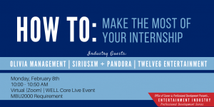 Join this employer panel to learn ways to succeed in your internship and get the most out of the experience. Entertainment industry professionals will cover everything from how to find the right internship, how to build relationships within the internship, how to NOT ruin your reputation, and how to be the “rock star” intern.