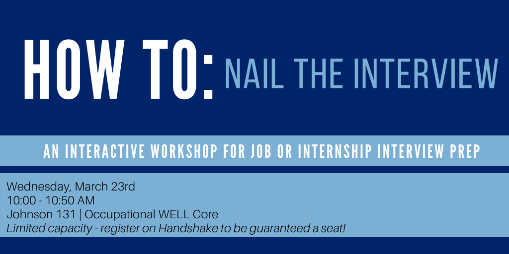 Would you like to feel more confident during your next interview? Join us for HOW TO: Nail The Interview! This interactive workshop will cover virtual and in-person interview techniques, interview prep strategies and the Top 10 questions most often asked by internship and job recruiters. Come prepared to practice your interview skills and receive feedback from career development specialists.