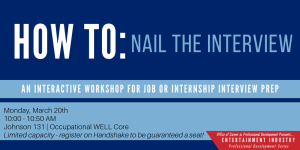 Would you like to feel more confident during your next interview? Join us for HOW TO: Nail The Interview! This interactive workshop will cover virtual and in-person interview techniques, interview prep strategies and the Top 10 questions most often asked by internship and job recruiters. Come prepared to practice your interview skills and receive feedback from career development specialists.