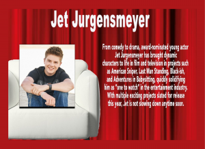 Additional film credits for Jet include Inspire Network’s “The Legend of 5 Mile Cave”, starring in Nickelodeon’s “Legends of the Hidden Temple,” Disney’s “Adventures in Babysitting,” appearing in the Oscar-nominated, Clint Eastwood film “American Sniper,” Universal’s “The Little Rascals Save the Day” as Spanky, PureFlix Cinema’s “Woodlawn,” and alongside Reese Witherspoon in “Devil’s Knot.” On the television front, Jet boasts an extensive list of credits including “CSI: Crime Scene Investigation” [CBS], “Hot in Cleveland” [TV Land], “Marry Me” [NBC], “Grey’s Anatomy” [ABC], “Austin & Ally” [The Disney Channel] and “Black-ish” [ABC]. He has also lent his voice to several animated projects over the years, including series regular roles for both Nickelodeon’s “Shimmer and Shine” and “Bubble Guppies,” as well as Amazon’s “Stinky & Dirt.”