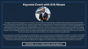 It’s a compelling story. On August 21, 2020, Dover Motorsports, Inc. named Erik A. Moses President & General Manager of Nashville Superspeedway,becoming the first Black person to hold that title at any NASCAR track in the sport’s history. Mr. Moses is leading the efforts to revitalize and reposition the Nashville Superspeedway into a premier motorsports and live event venue. His story unfolds during a Fireside Chat with him and interviewer, Prof. Cheryl Carr, Associate Dean & Professor, Curb College. This keynote event offers insights for the entertainment, live event, sports, and tourism/hospitality industries.