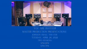 Master Production Presentations File under: on April 11, 2022 Calendar Add to Calendar Add to Timely Calendar Add to Google Add to Outlook Add to Apple Calendar Add to other calendar Export to XML When: April 26, 2022 @ 5:00 pm – 6:00 pm 2022-04-26T17:00:00-05:00 2022-04-26T18:00:00-05:00 Where: Johnson Small Theater 114 Contact: Alan Shacklock Email