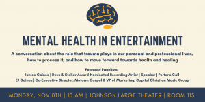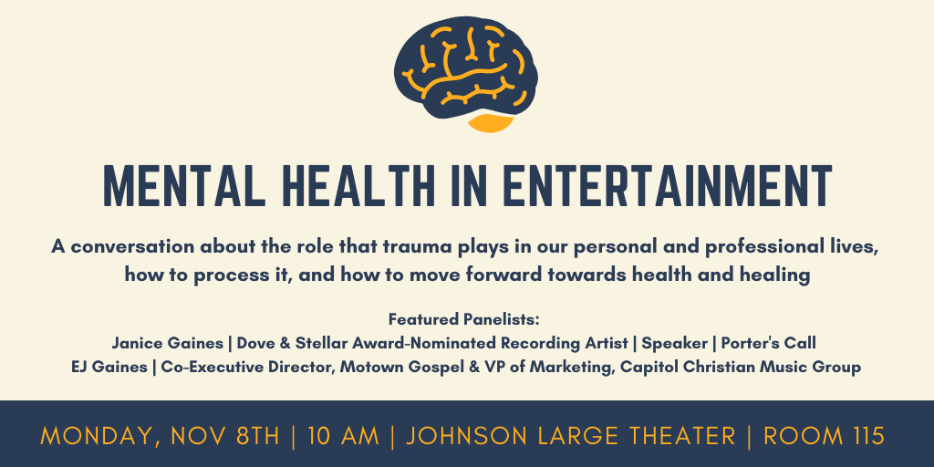 Mental Health In Entertainment File under: on October 25, 2021November 1, 2021 Calendar Add to Calendar Add to Timely Calendar Add to Google Add to Outlook Add to Apple Calendar Add to other calendar Export to XML When: November 8, 2021 @ 10:00 am – 10:50 am 2021-11-08T10:00:00-06:00 2021-11-08T10:50:00-06:00 Where: Johnson 115 Contact: Nina Woodard 615.460.5988 Email Seminar Student Enrichment