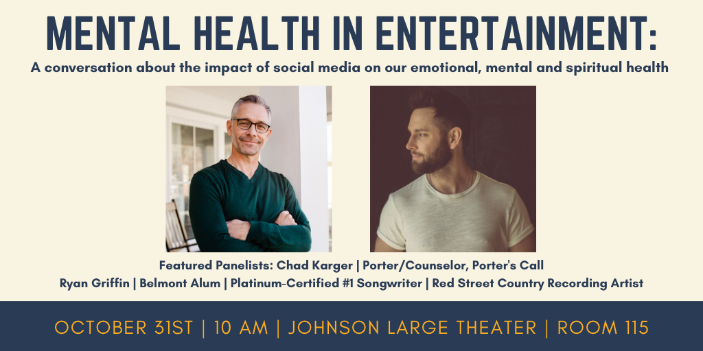 Mental Health in Entertainment: The Impact of Social Media File under: on October 12, 2022 Calendar Add to Calendar Add to Timely Calendar Add to Google Add to Outlook Add to Apple Calendar Add to other calendar Export to XML When: October 31, 2022 @ 10:00 am – 10:50 am 2022-10-31T10:00:00-05:00 2022-10-31T10:50:00-05:00 Where: Johnson Large Theater Room 115 Contact: Nina Woodard 615.460.5988 Email Career Development Student Enrichment