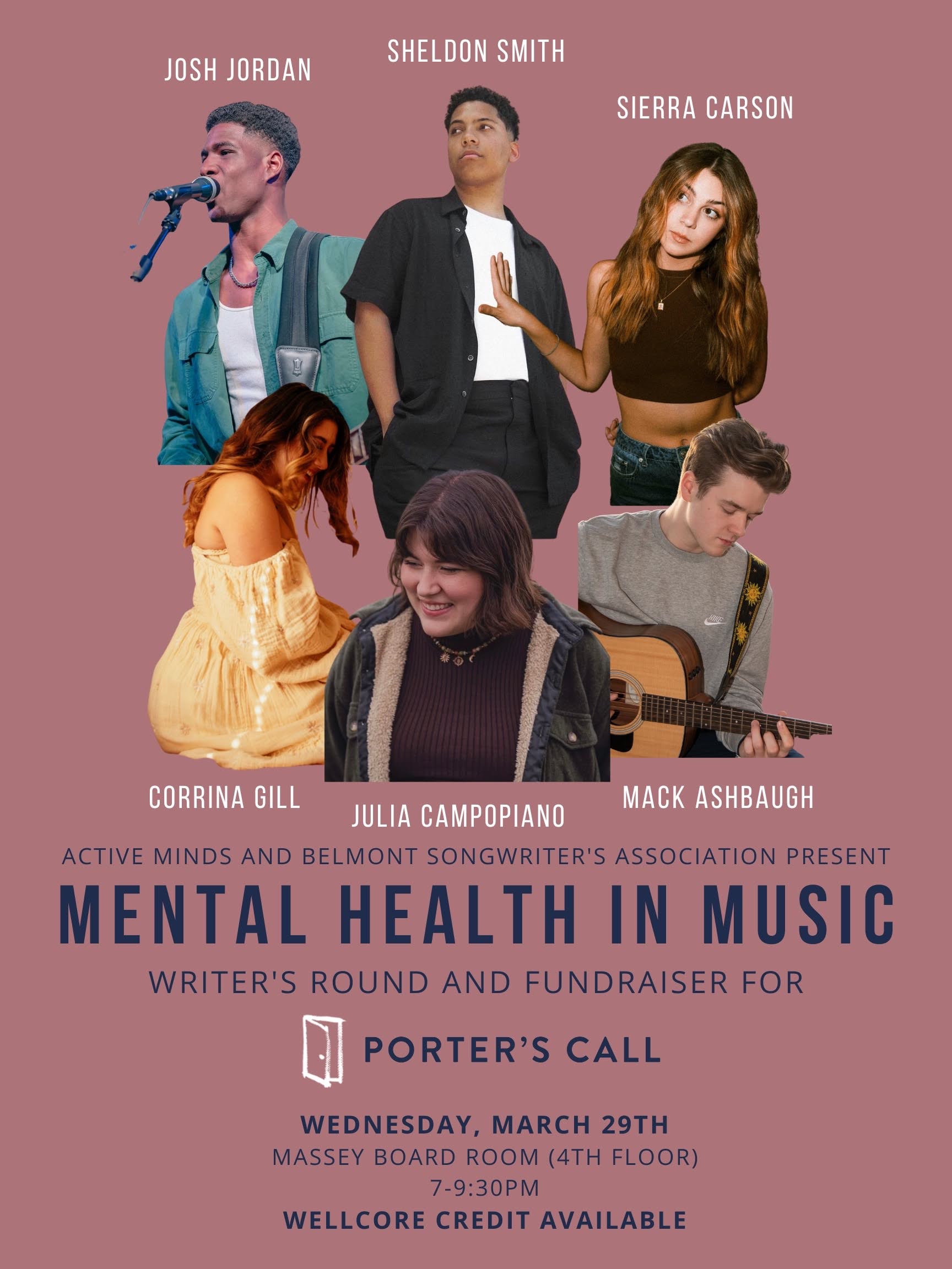 Mental Health in Music: Writers Round & Fundraiser File under: on March 16, 2023 Calendar Add to Calendar Add to Timely Calendar Add to Google Add to Outlook Add to Apple Calendar Add to other calendar Export to XML When: March 29, 2023 @ 7:00 pm – 9:30 pm 2023-03-29T19:00:00-05:00 2023-03-29T21:30:00-05:00 Showcase Student Enrichment