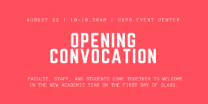 Opening Convocation File under: on July 26, 2018 Calendar Add to Calendar Add to Timely Calendar Add to Google Add to Outlook Add to Apple Calendar Add to other calendar Export to XML When: August 22, 2018 @ 10:00 am – 10:50 am 2018-08-22T10:00:00-05:00 2018-08-22T10:50:00-05:00 Where: Curb Event Center