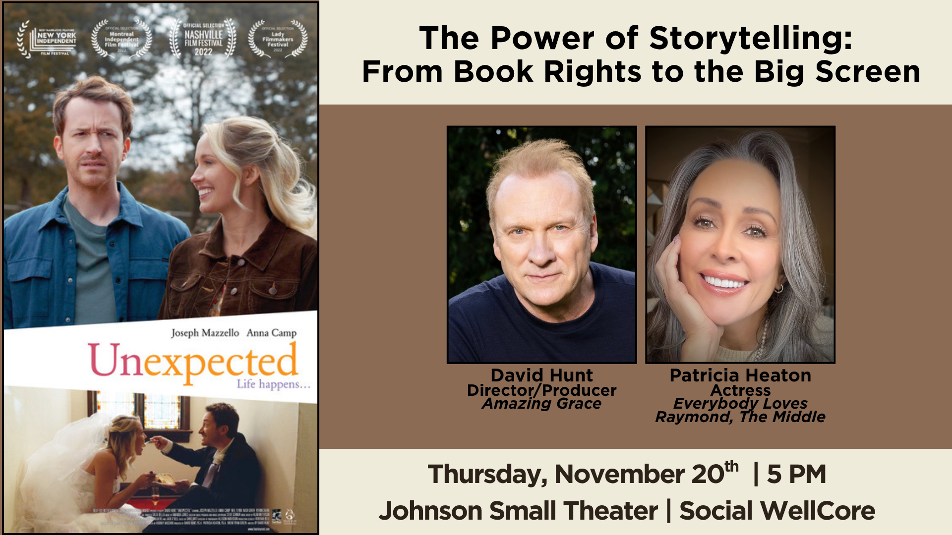 Join us for a screening of David Hunt’s “Unexpected” and a discussion on the power of hopeful storytelling, how books become movies, and the challenges faced while creating a feature film.