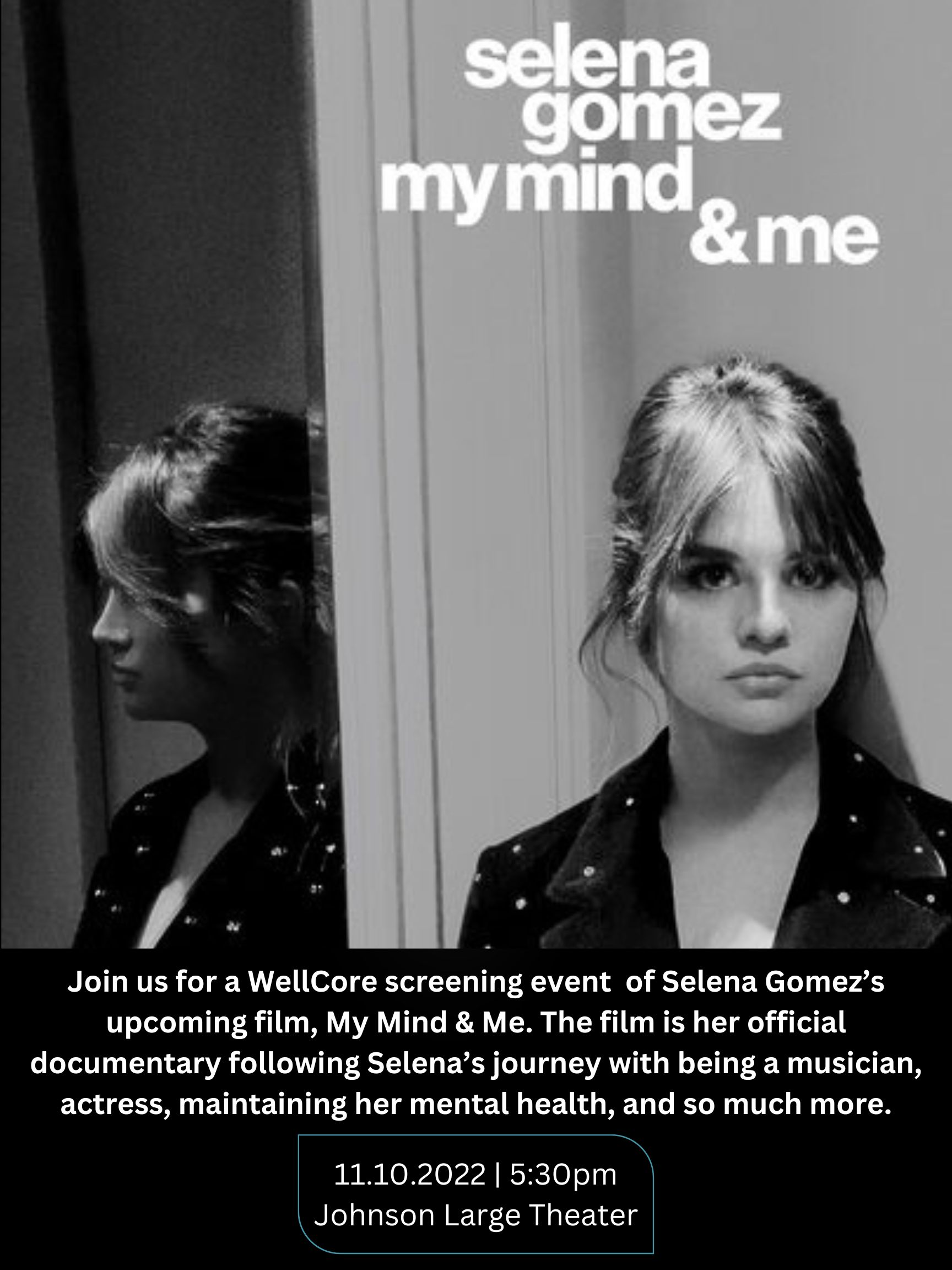 Selena Gomez: My Mind & Me – Screening Event File under: on November 5, 2022November 5, 2022 Calendar Add to Calendar Add to Timely Calendar Add to Google Add to Outlook Add to Apple Calendar Add to other calendar Export to XML When: November 10, 2022 @ 5:30 pm – 7:15 pm 2022-11-10T17:30:00-06:00 2022-11-10T19:15:00-06:00 Where: Johnson Center Large Theater- 115