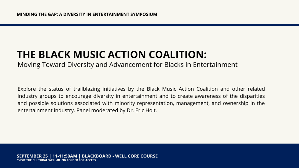The Black Music Coalition: Moving Toward Diversity and Advancement for Blacks in Entertainment File under: on September 14, 2020September 14, 2020 Calendar Add to Calendar Add to Timely Calendar Add to Google Add to Outlook Add to Apple Calendar Add to other calendar Export to XML When: September 25, 2020 @ 11:00 am – 11:50 am 2020-09-25T11:00:00-05:00 2020-09-25T11:50:00-05:00 Where: WELL Core Course - Cultural Well-Being Contact: Jenny Lokey Email