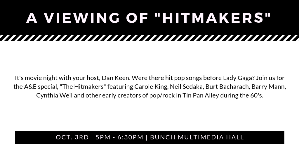 A Viewing of “Hitmakers” File under: on September 24, 2018September 24, 2018 Calendar Add to Calendar Add to Timely Calendar Add to Google Add to Outlook Add to Apple Calendar Add to other calendar Export to XML When: October 3, 2018 @ 5:00 pm – 6:30 pm 2018-10-03T17:00:00-05:00 2018-10-03T18:30:00-05:00 Where: Bunch Multimedia Hall Contact: Dan Keen Email Student Enrichment