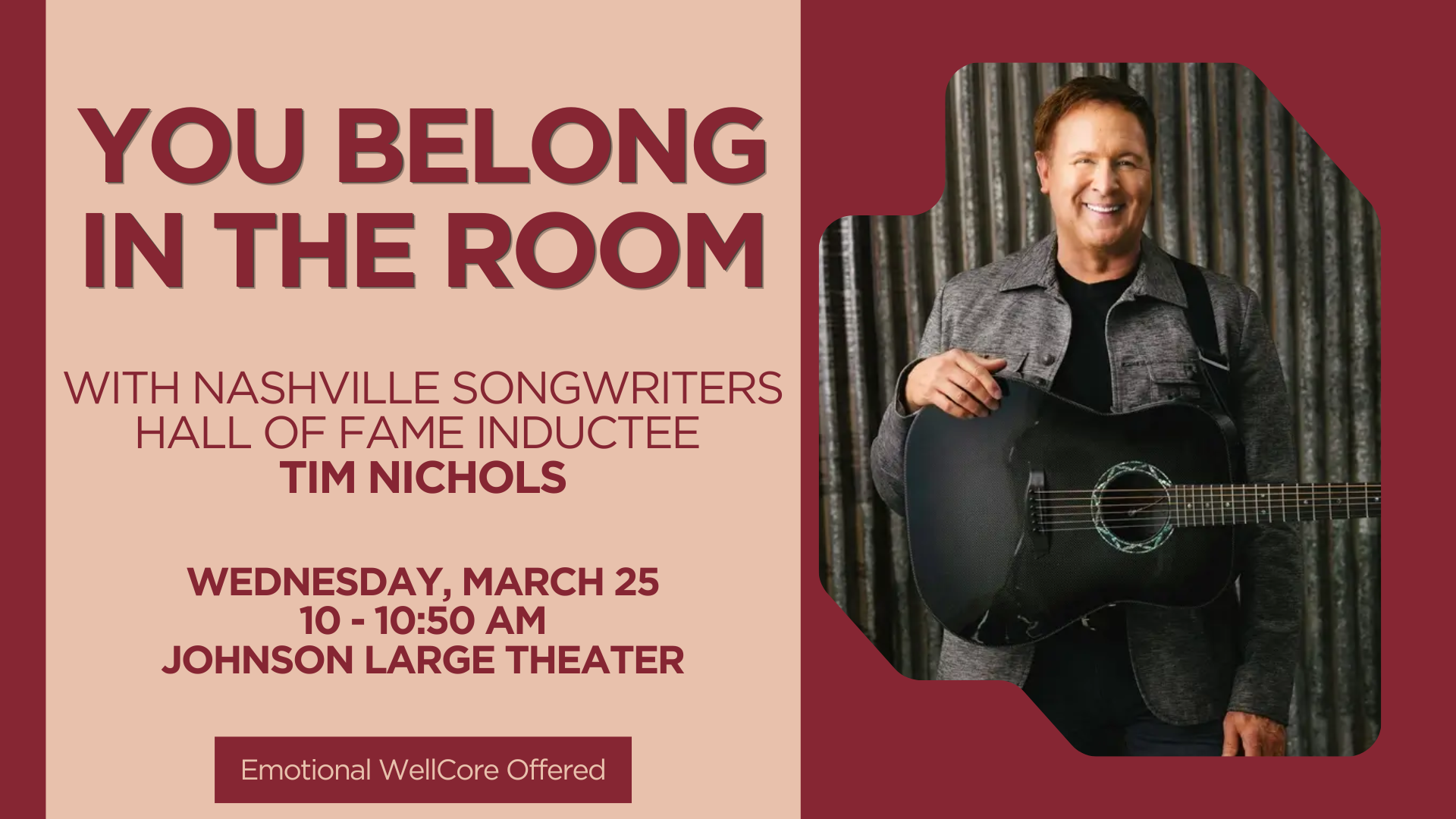 Today, Tim continues to write hits for some of country music’s biggest stars. A sought-after keynote speaker, Tim speaks to audiences about creativity, collaboration, and lessons learned from a life spent working with some of the most popular musical artists in the world. Over his four-decade career as one of Nashville’s most respected songwriters, Tim Nichols has learned a crucial component must be in place before the creative process even begins: no matter where you are, no matter who you’re there with, you need to believe that you belong in the room.
